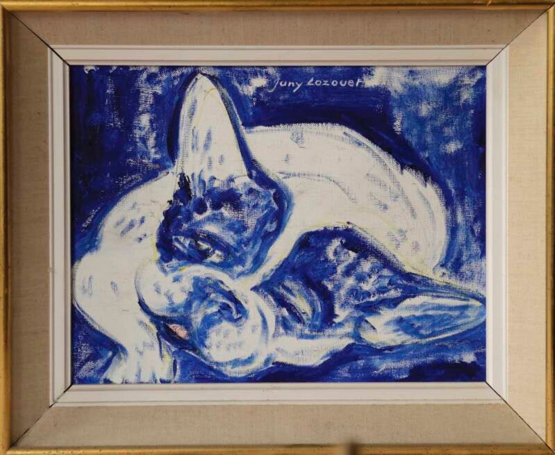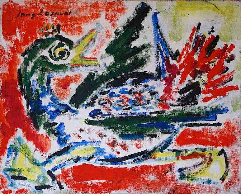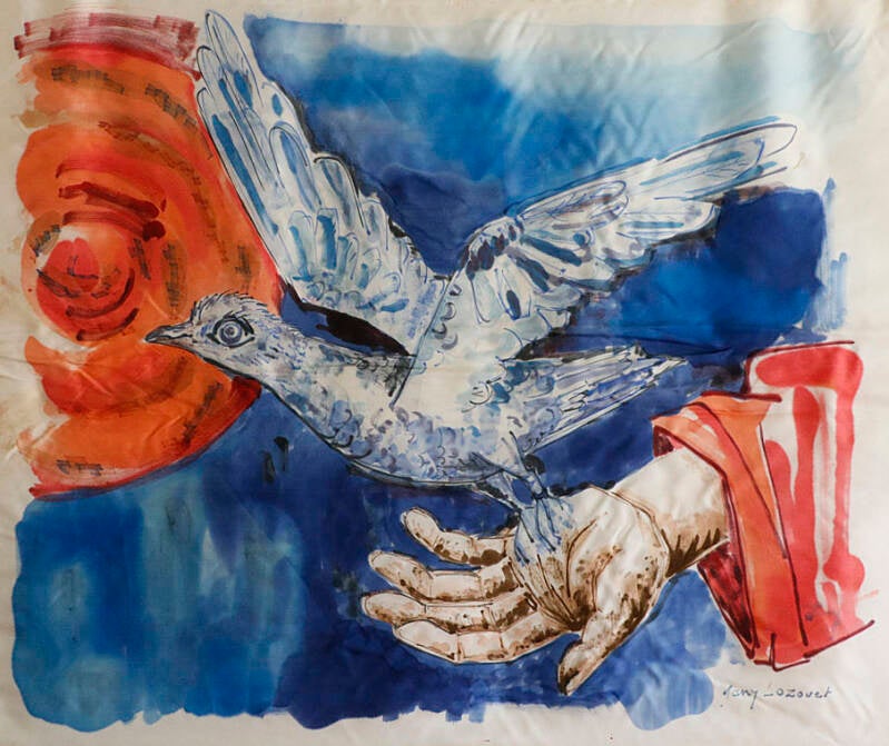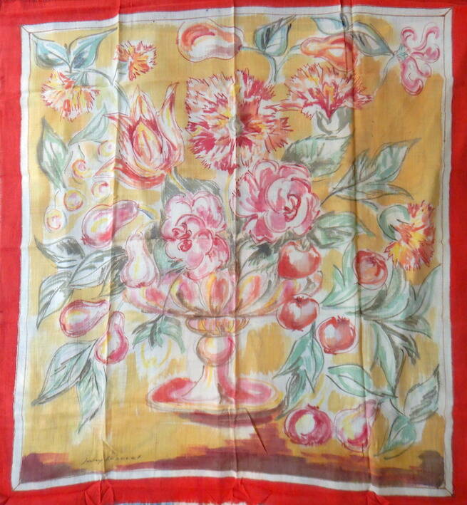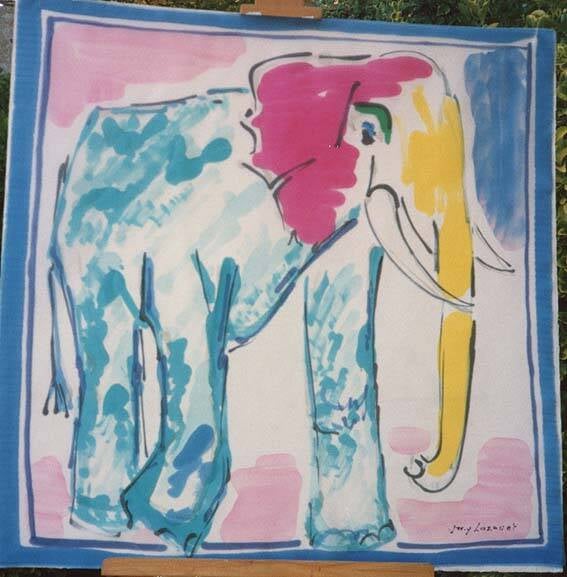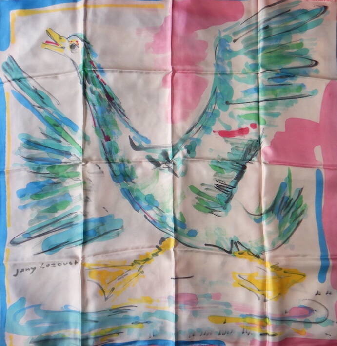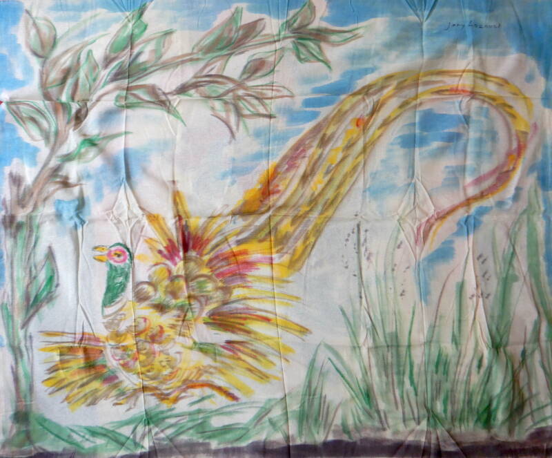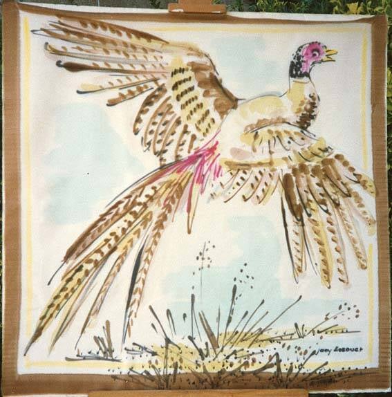 panneaux et foulards sur le thème de la nature en Sologne, étangs, canards, faisants, coqs, oiseaux, fleurs et d'ailleurs éléphant, panthère, ainsi que Pierrot, Arlequin, un voilier, et une jolie femme portant une robe colorée.